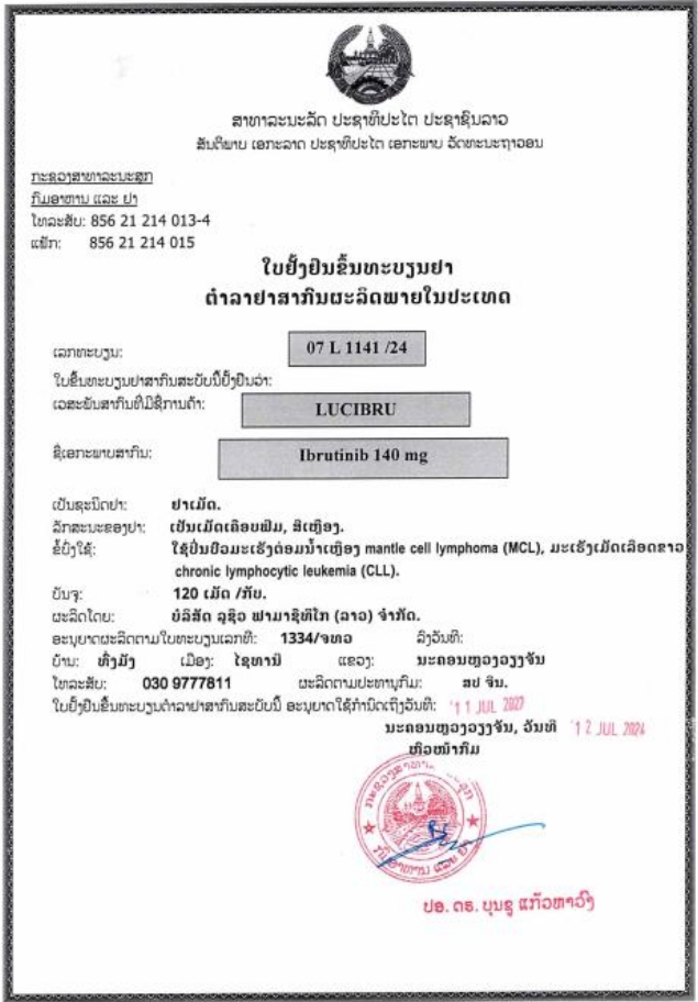 老挝国家药品批准文号:07 L 1141/24